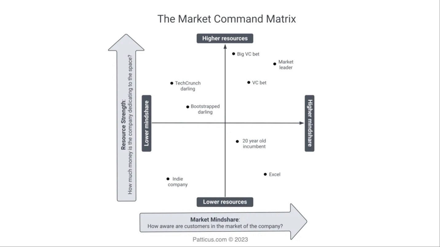 It is important to call out that most companies in the lower middle market (<$50MM in revenue) will be in the lower left, which provides the latitude to attack (very prescriptively) the competitors with the highest "command of market" (i.e. the upper right).